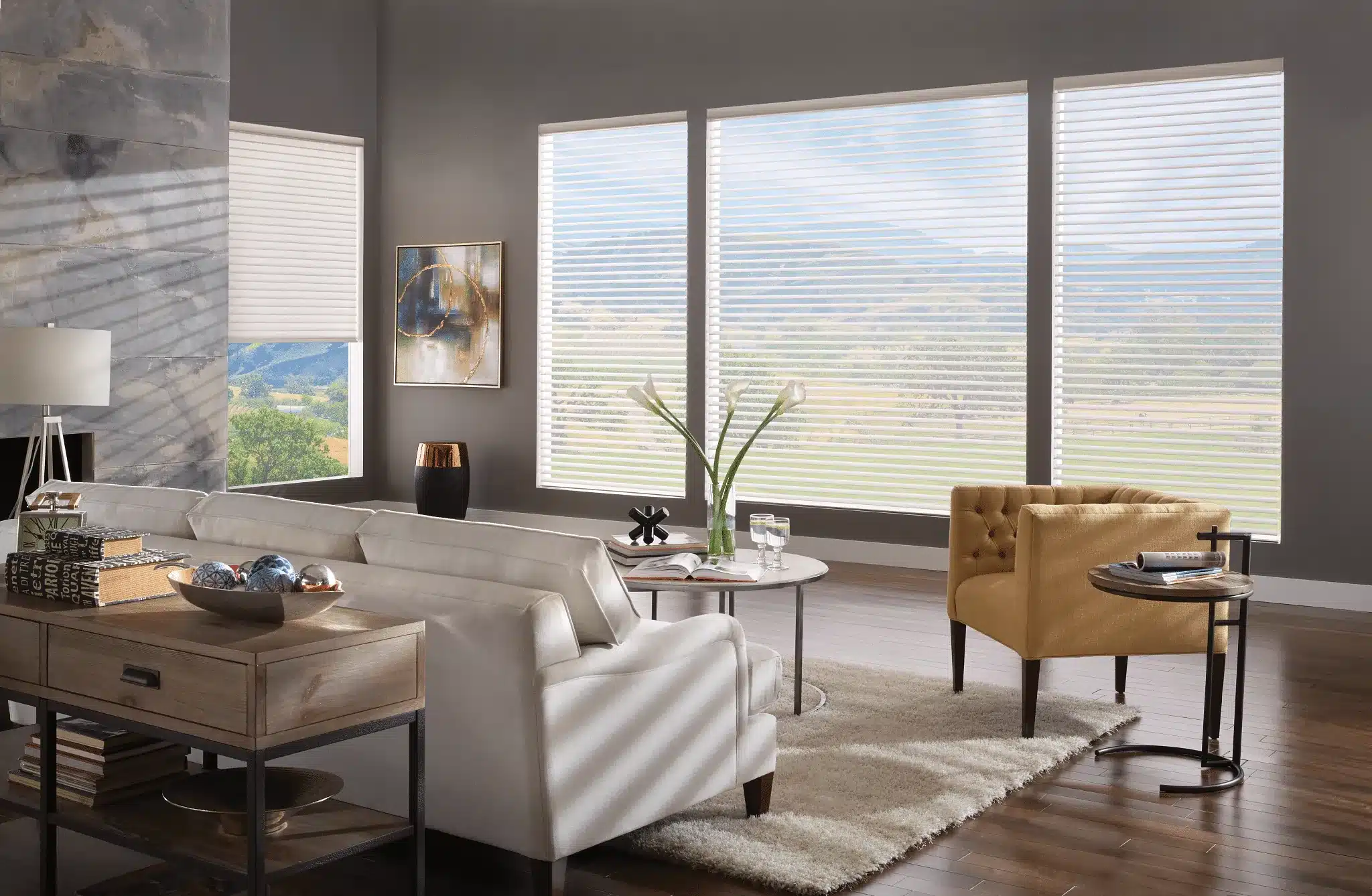 Sheer Shades provide a nice mix of controlling light and privacy. They have thin fabric pieces between two sheer layers, giving a gentle, soft lighting. This innovative window treatment merges the airy beauty of sheers with the practical function of blinds, allowing for a seamless transition from a gentle glow to privacy with a simple adjustment.